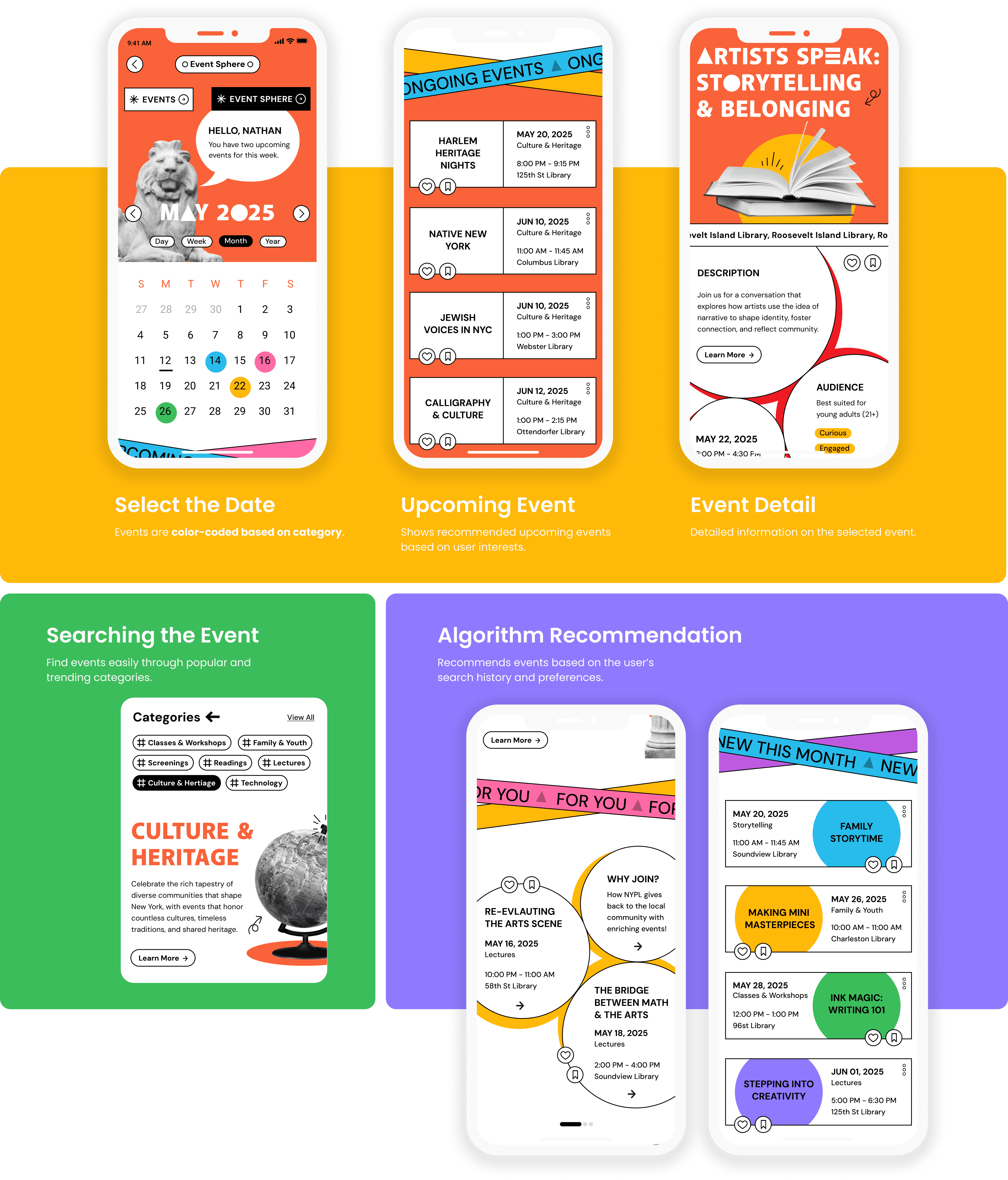 Conducting user research and designing the NYPL app’s UI, including wireframes, visuals, and interaction flows, while creating motion designs for new features to enhance usability and engagement.